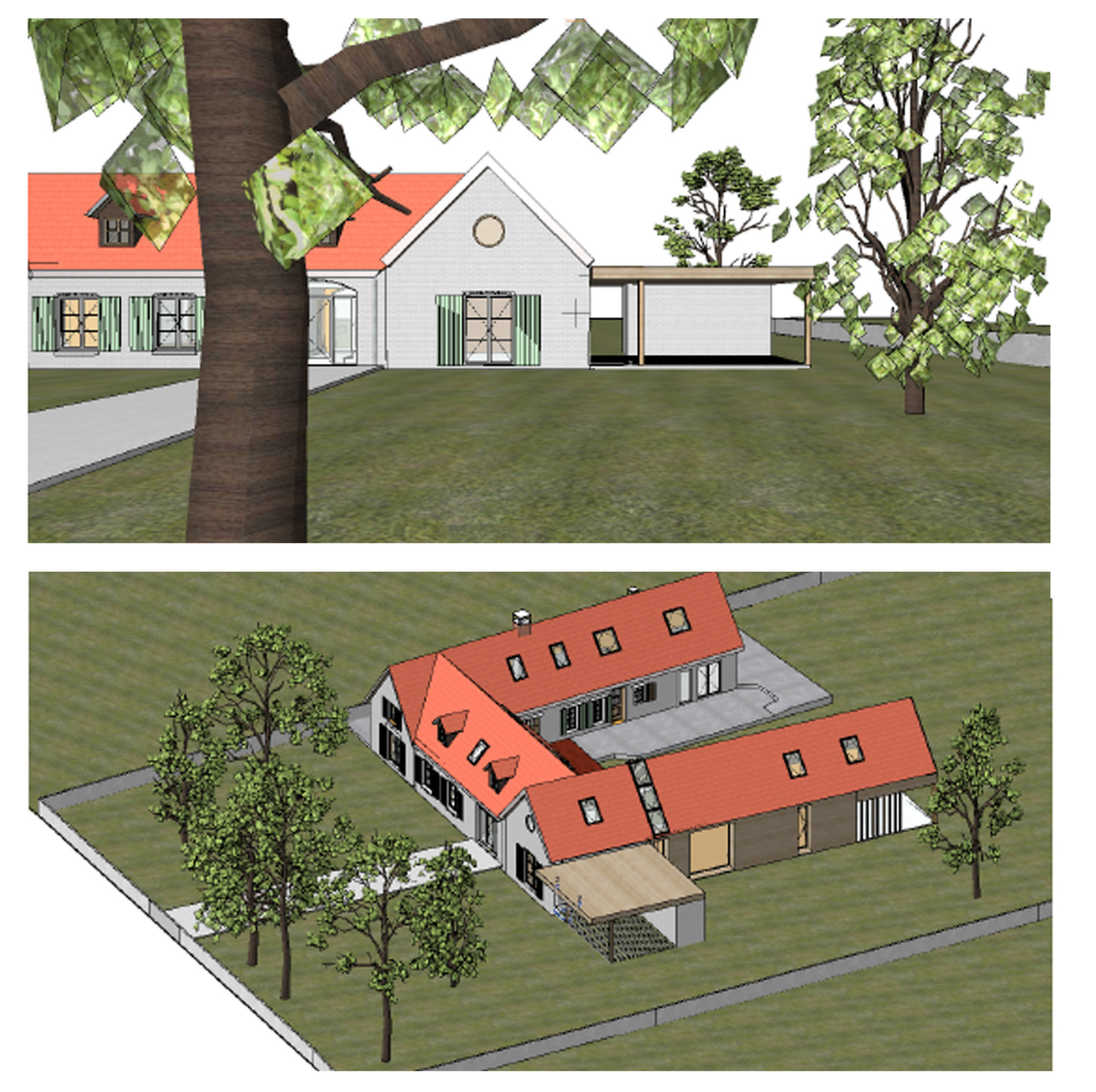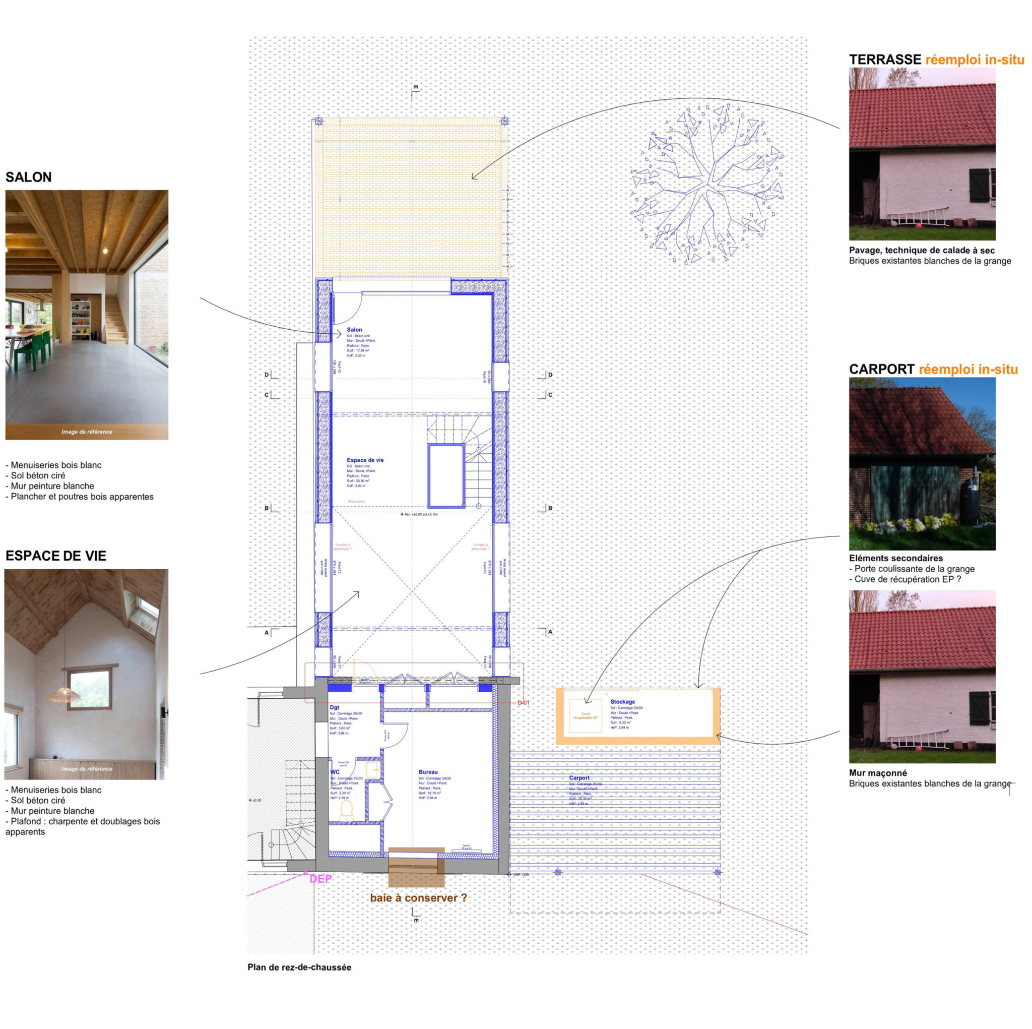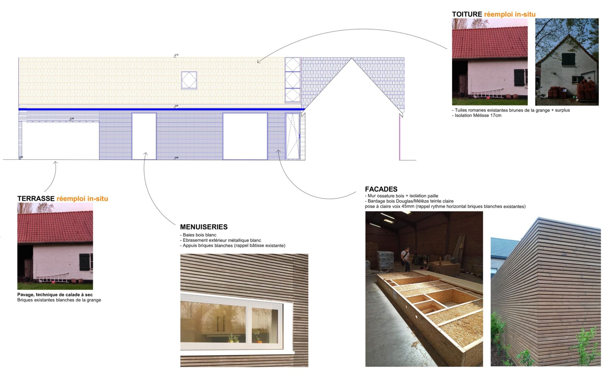 Le projet vise à rénover thermiquement une partie du corps de ferme et à reconstruire une aile dans le volume existant en utilisant des matériaux biosourcés.